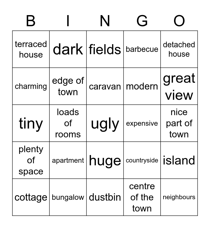 This bingo card has a free space and 24 words: apartment, bungalow, caravan, cottage, detached house, terraced house, charming, dark, expensive, huge, modern, tiny, countryside, island, edge of town, centre of the town, nice part of town, fields, great view, loads of rooms, neighbours, plenty of space, barbecue and dustbin.