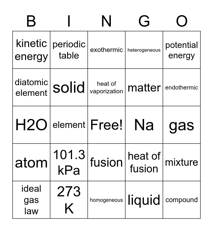 This bingo card has a free space and 24 words: 101.3 kPa, 273 K, heat of vaporization, ideal gas law, potential energy, kinetic energy, diatomic element, periodic table, Na, fusion, matter, H2O, heat of fusion, mixture, solid, liquid, gas, exothermic, endothermic, element, compound, atom, heterogeneous and homogeneous.