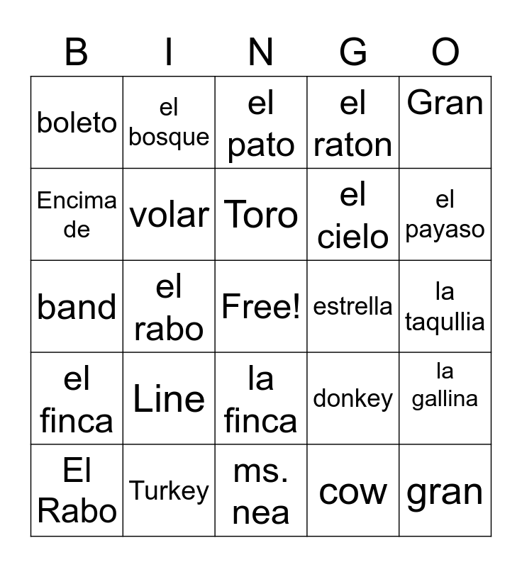This bingo card has a free space and 24 words: Line, Turkey, Toro, El Rabo, Gran, boleto, Encima de, el bosque, estrella, la finca, el cielo, band, donkey, la gallina, volar, cow, la taqullia, el pato, el payaso, el rabo, gran, el finca, el raton and ms. nea.
