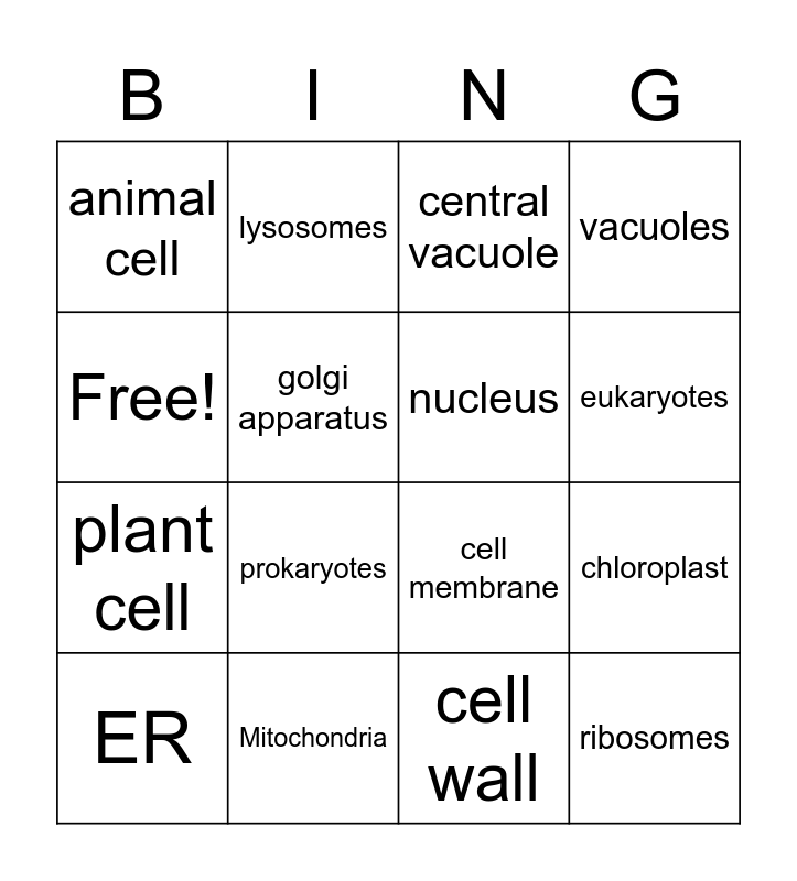This bingo card has 16 words: Mitochondria, chloroplast, central vacuole, animal cell, plant cell, lysosomes, cell membrane, cell wall, Free!, golgi apparatus, ER, vacuoles, prokaryotes, eukaryotes, nucleus and ribosomes.