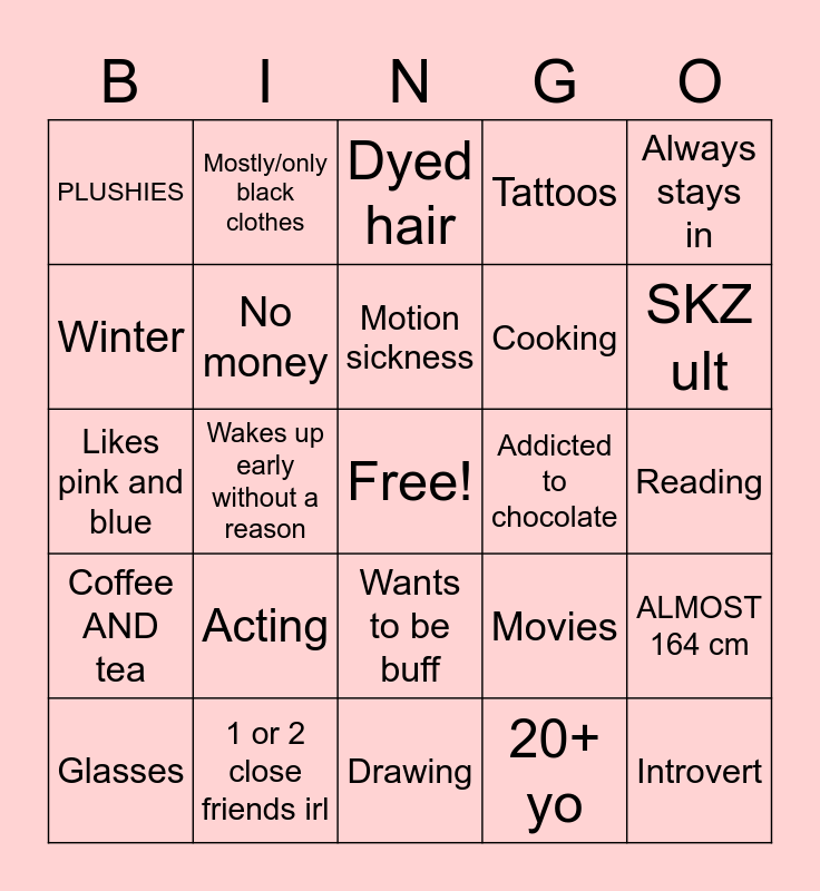 This bingo card has a free space and 24 words: Acting, 1 or 2 close friends irl, Motion sickness, Glasses, Always stays in, PLUSHIES, Winter, Mostly/only black clothes, Addicted to chocolate, Wants to be buff, Cooking, Likes pink and blue, Movies, ALMOST 164 cm, No money, 20+ yo, Reading, Dyed hair, SKZ ult, Wakes up early without a reason, Introvert, Coffee AND tea, Tattoos and Drawing.