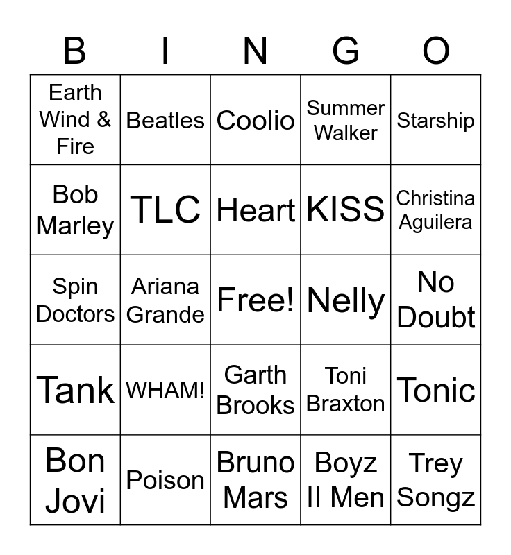 This bingo card has a free space and 24 words: WHAM!, Poison, Heart, Bon Jovi, Starship, Earth Wind & Fire, Bob Marley, Beatles, Nelly, Garth Brooks, KISS, Spin Doctors, Toni Braxton, Tonic, TLC, Boyz II Men, No Doubt, Coolio, Christina Aguilera, Ariana Grande, Trey Songz, Tank, Summer Walker and Bruno Mars.