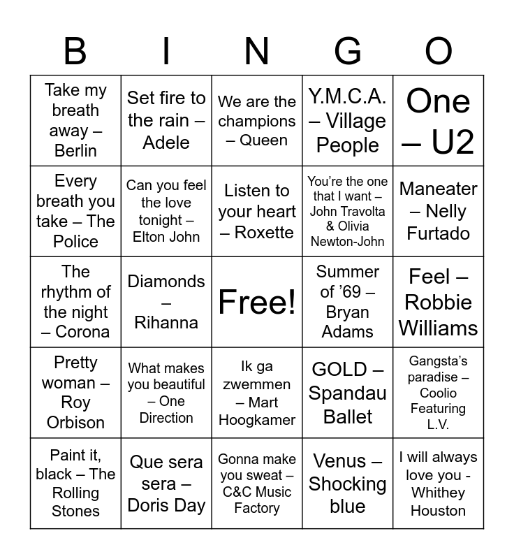 This bingo card has a free space and 60 words: Hound dog – Elvis Presley, Que sera sera – Doris Day, I want to hold your hand – The Beatles, Pretty woman – Roy Orbison, Venus – Shocking blue, Waterloo – Abba, Can you feel the love tonight – Elton John, Daddy cool – Boney M., You’re the one that I want – John Travolta & Olivia Newton-John, Denis – Blondie, Y.M.C.A. – Village People, Go your own way – Fleetwood Mac, Every breath you take – The Police, Hello – Lionel Richie, Take on me – a-ha, Take my breath away – Berlin, I will always love you - Whithey Houston, One – U2, Thriller - Michael Jackson, Listen to your heart – Roxette, Summer of ’69 – Bryan Adams, We are the champions – Queen, Paint it, black – The Rolling Stones, Gangsta’s paradise – Coolio Featuring L.V., If I could turn back time – Cher, My heart will go on – Celine Dion, It’s my life – Bon Jovi, Whenever, wherever – Shakira, Maneater – Nelly Furtado, Viva la vida – Coldplay, Right round – Flo Rida, I gotta feeling – Black Eyed Peas, Poker face – Lady Gaga, Gangnam style – PSY, Set fire to the rain – Adele, Cheap thrills – Sia feat. Sean Paul, Shape of you – Ed Sheeran, Diamonds – Rihanna, Crazy in love – Beyoncé feat. Jaz-Z, The rhythm of the night – Corona, The Best – Tina Turner, What makes you beautiful – One Direction, Feel – Robbie Williams, Whatta man – Salt-N-Peppa, GOLD – Spandau Ballet, Lambada – Kaoma, MMMBop – Hanson, It's Raining Men – The Weather Girls, Funkytown – Lipps Inc., Ik ga zwemmen – Mart Hoogkamer, Gonna make you sweat – C&C Music Factory, Noodgeval – Goldband, Somebody that I used to know – Gotye, The sound of silence – Disturbed, Nothing else matters – Metallica, Du hast – Rammstein, The reason – Hoobastank, In the end - Linkin Park, Mother earth - Within temptation and Everybody – Backstreet Boys.