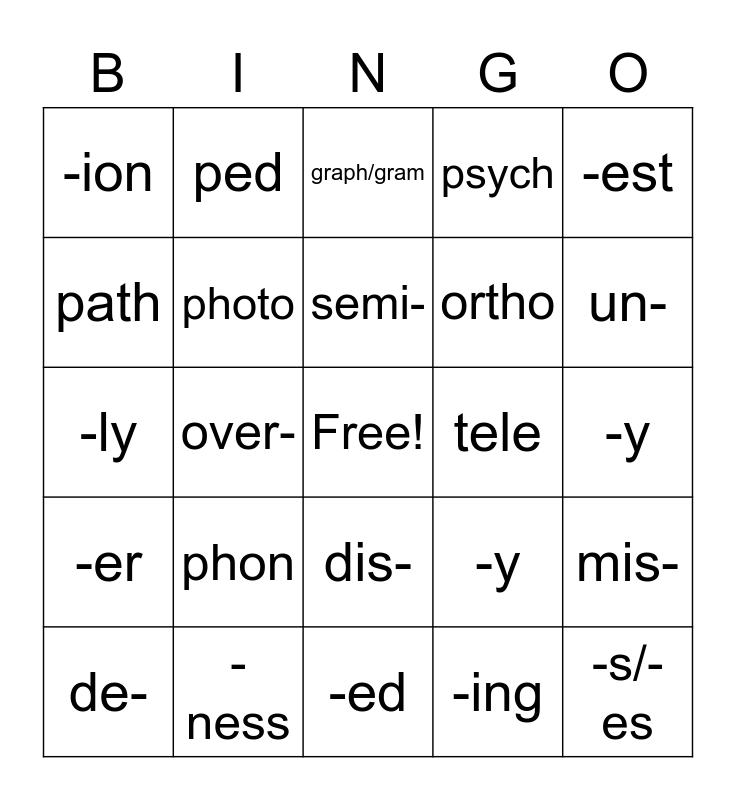 This bingo card has a free space and 29 words: de-, non-, over-, -er/-or, -ion, graph/gram, photo, phon, tele, -ness, -y, -s/-es, -ed, -ing, un-, mis-, dis-, -er, -est, -ly, -y, mal-, ortho, path, psych, ped, mis-, semi- and chron(o).
