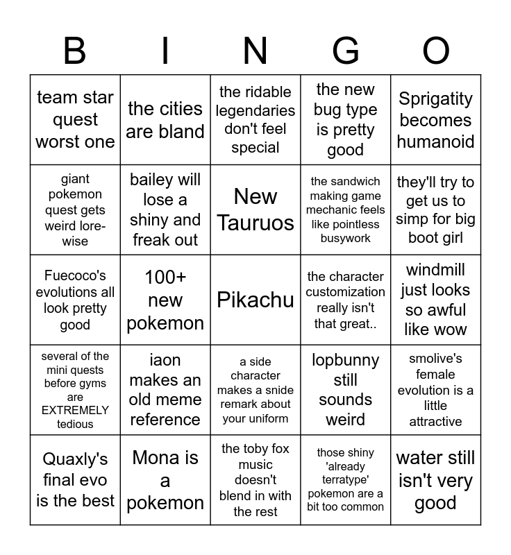 This bingo card has a free space and 24 words: iaon makes an old meme reference, Mona is a pokemon, New Tauruos, Quaxly's final evo is the best, Sprigatity becomes humanoid, team star quest worst one, giant pokemon quest gets weird lore-wise, the cities are bland, the character customization really isn't that great.., a side character makes a snide remark about your uniform, the sandwich making game mechanic feels like pointless busywork, Fuecoco's evolutions all look pretty good, lopbunny still sounds weird, smolive's female evolution is a little attractive, bailey will lose a shiny and freak out, those shiny 'already terratype' pokemon are a bit too common, windmill just looks so awful like wow, the ridable legendaries don't feel special, they'll try to get us to simp for big boot girl, 100+ new pokemon, water still isn't very good, several of the mini quests before gyms are EXTREMELY tedious, the new bug type is pretty good and the toby fox music doesn't blend in with the rest.