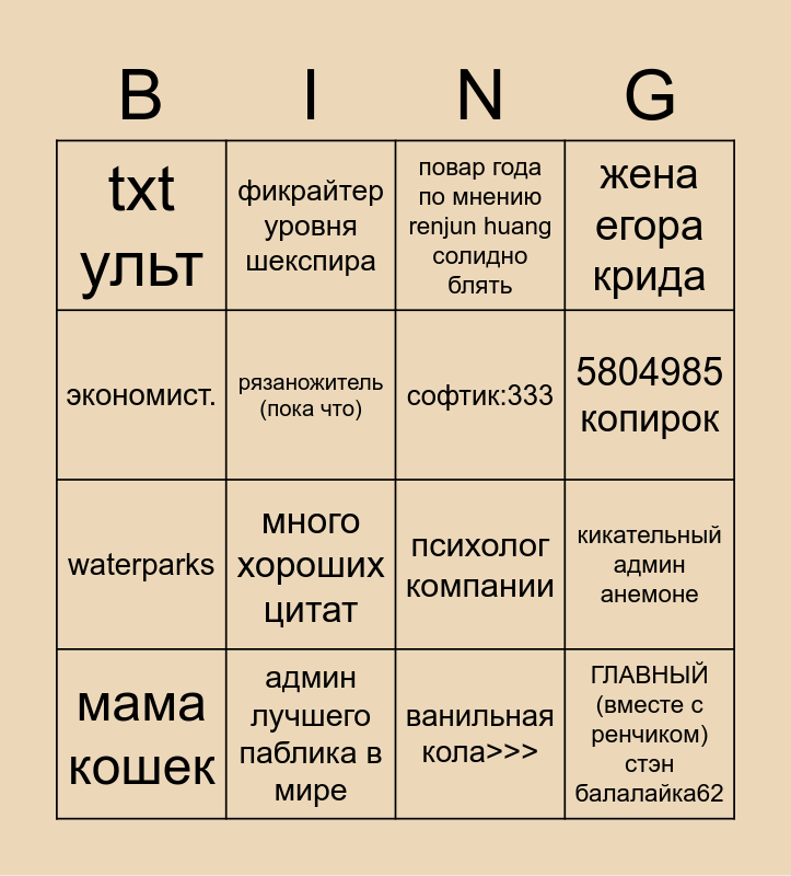 This bingo card has 16 words: админ лучшего паблика в мире, кикательный админ анемоне, повар года по мнению renjun huang солидно блять, txt ульт, waterparks, фикрайтер уровня шекспира, психолог компании, ванильная кола>>>, экономист., рязаножитель (пока что), мама кошек, жена егора крида, много хороших цитат, 5804985 копирок, софтик:333 and ГЛАВНЫЙ (вместе с ренчиком) стэн балалайка62.