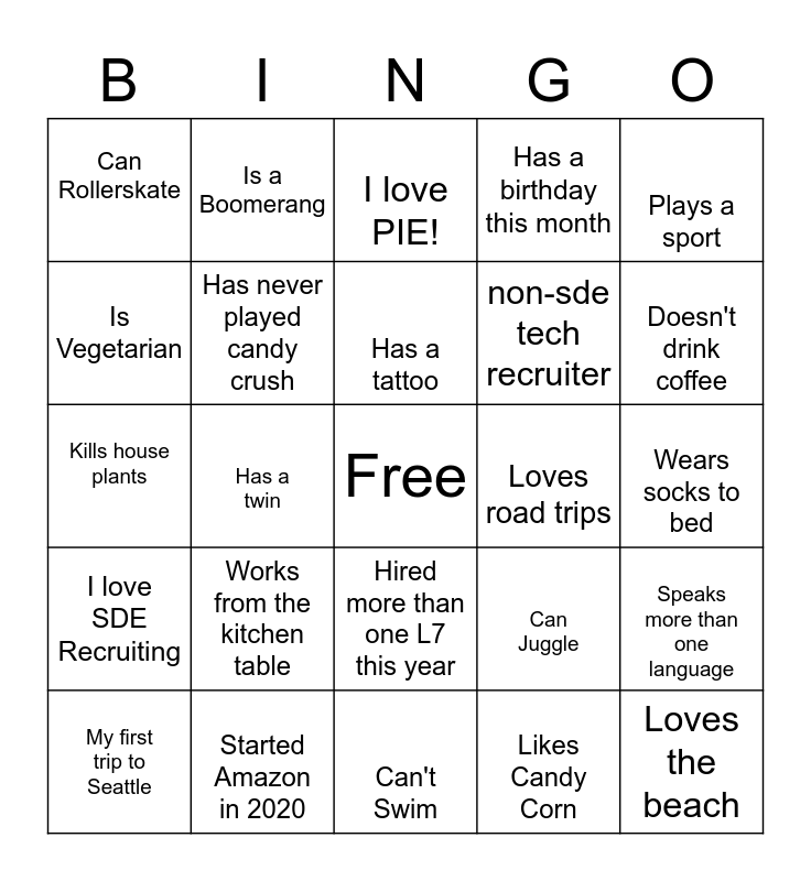 This bingo card has a free space and 24 words: Works from the kitchen table, Started Amazon in 2020, Has a tattoo, My first trip to Seattle, Plays a sport, Can Rollerskate, Is Vegetarian, Is a Boomerang, Loves road trips, Hired more than one L7 this year, non-sde tech recruiter, Kills house plants, Can Juggle, Speaks more than one language, Has never played candy crush, Likes Candy Corn, Wears socks to bed, I love PIE!, Doesn't drink coffee, Has a twin, Loves the beach, I love SDE Recruiting, Has a birthday this month and Can't Swim.