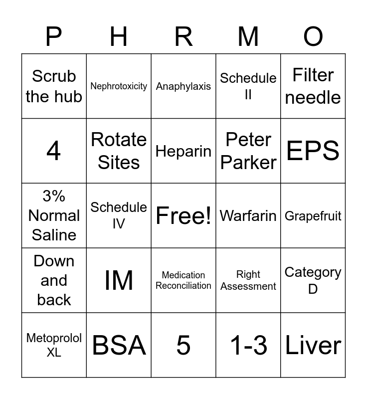 This bingo card has a free space and 34 words: 2347, 1-3, Nutrition, Hepatotoxicity, Down and back, Rotate Sites, Filter needle, Metoprolol XL, Nephrotoxicity, Up and out, Heparin, Anaphylaxis, Anticholinergics, Deltoid, Warfarin, EPS, BSA, 3% Normal Saline, IM, Right Assessment, Medication Reconciliation, Angioedema, Scrub the hub, Grapefruit, 5, Liver, Schedule II, Category A, Peter Parker, 4, Kidneys, Schedule IV, Category D and Bob.