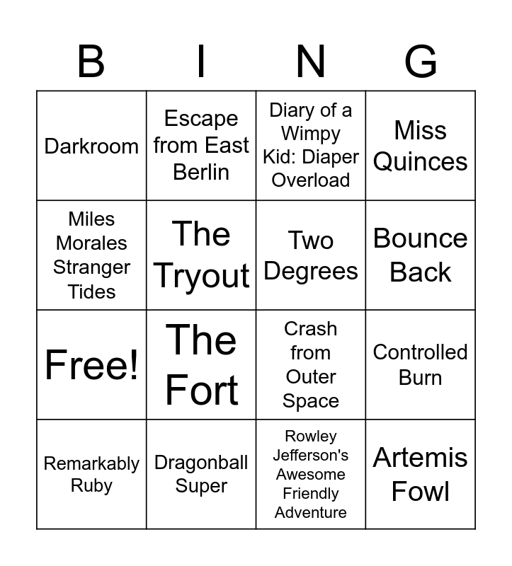 This bingo card has 20 words: Controlled Burn, The Last Kids on Earth, Diary of a Wimpy Kid: Diaper Overload, Five Nights at Freddys: Tales from the Pizzaplex, Remarkably Ruby, Miles Morales Stranger Tides, Dragonball Super, Darkroom, Free!, Escape from East Berlin, The Fort, Crash from Outer Space, The Tryout, Artemis Fowl, Two Degrees, My Hero Academia, Bounce Back, Miss Quinces, Rowley Jefferson's Awesome Friendly Adventure and Paws.