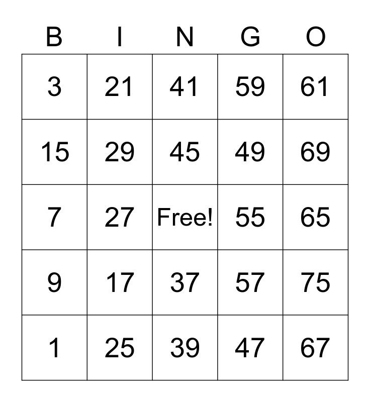 This bingo card has a free space and 24 words: 1, 17, 45, 47, 61, 3, 21, 41, 55, 65, 7, 29, 57, 75, 15, 25, 39, 59, 69, 9, 27, 37, 49 and 67.