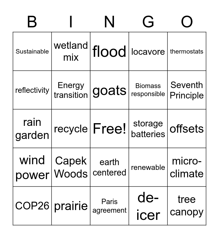 This bingo card has a free space and 55 words: Energy mix, COP26, Greenwashing, Sustainable, Paris agreement, Fast fashion, Energy transition, Carbon tax, Biomass responsible, interconnected, locavore, sleep mode, window covering, insulation, R-factor, solar array, thermostats, recycle, pollinator, tree canopy, storage batteries, net zero, renewable, flood, sharing, goats, de-icer, ice cap, offsets, micro-climate, heat exchanger, compost, tipping point, native plants, reflectivity, rain garden, windbreak, wind power, vegan, mindful, wetland mix, water retention, trees, 96%, Capek Woods, prairie, burr oak, Pagan, brainstorming, Seventh Principle, rock salt, Climate Change Resolution, heat pump, earth centered and nitrogen retention.