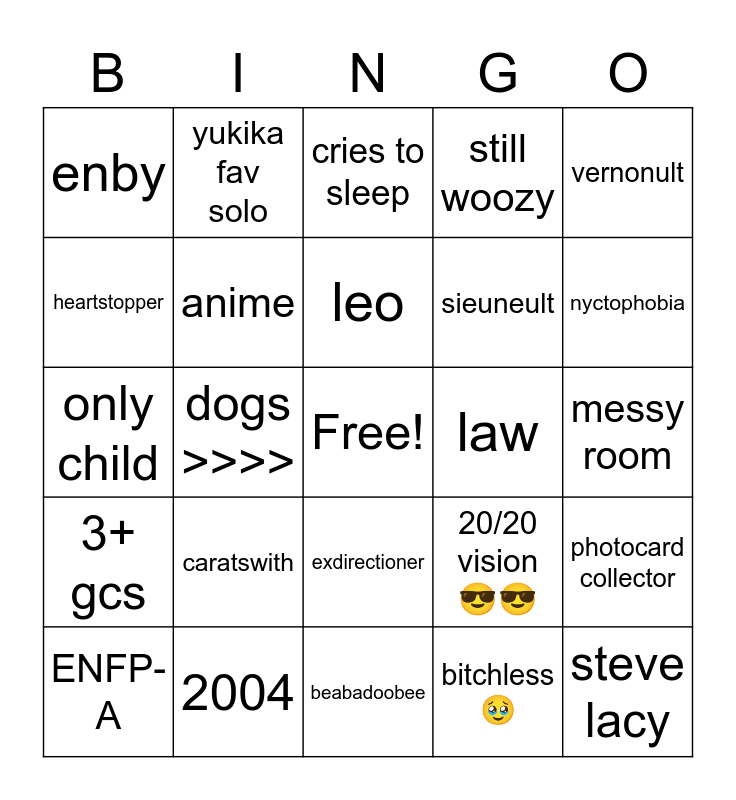 This bingo card has a free space and 24 words: caratswith, 2004, leo, ENFP-A, vernonult, enby, heartstopper, yukika fav solo, law, exdirectioner, sieuneult, only child, 20/20 vision 😎😎, photocard collector, anime, bitchless 🥹, messy room, cries to sleep, nyctophobia, dogs >>>>, steve lacy, 3+ gcs, still woozy and beabadoobee.