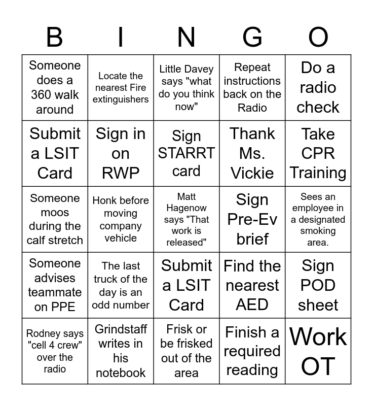 This bingo card has a free space and 29 words: Little Davey says "Send us another un!", Grindstaff writes in his notebook, Little Davey says "what do you think now", Submit a LSIT card, Do a radio check, Someone does a 360 walk around, Sign in on RWP, Sign STARRT card, Sign Pre-Ev brief, Sign POD sheet, Rodney says "cell 4 crew" over the radio, Honk before moving company vehicle, Finish a required reading, Work OT, Someone moos during the calf stretch, Go thru the PCM, Frisk or be frisked out of the area, Find the nearest AED, Take CPR Training, Someone advises teammate on PPE, The last truck of the day is an odd number, The last truck of the day is an even number, Thank Ms. Vickie, Sees an employee in a designated smoking area., Submit a LSIT Card, Locate the nearest Fire extinguishers, Submit a LSIT Card, Repeat instructions back on the Radio and Submit a LSIT Card.
