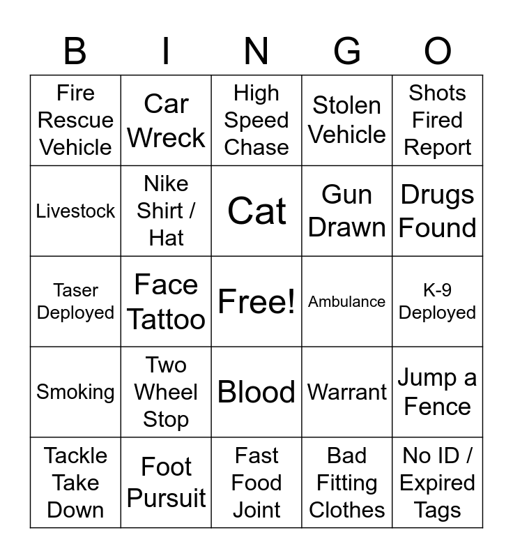 This bingo card has a free space and 35 words: Stuffed Animal / Toy, American Flag, Sports Shirt / Hat, Nike Shirt / Hat, Blood, Stolen Vehicle, Livestock, Hand Cuffs, Cat, Open Container, Taser Deployed, Shots Fired Report, Convenience Store, Pull Away / Slow Roller, Fire Rescue Vehicle, Ambulance, Bad Fitting Clothes, Face Tattoo, Smoking, No ID / Expired Tags, Warrant, Tackle Take Down, Jump a Fence, Foot Pursuit, High Speed Chase, Drugs Found, Weed Found, Gun Found, Gun Drawn, K-9 Deployed, Drug Store, Fast Food Joint, Two Wheel Stop, Car Wreck and Lights Out.