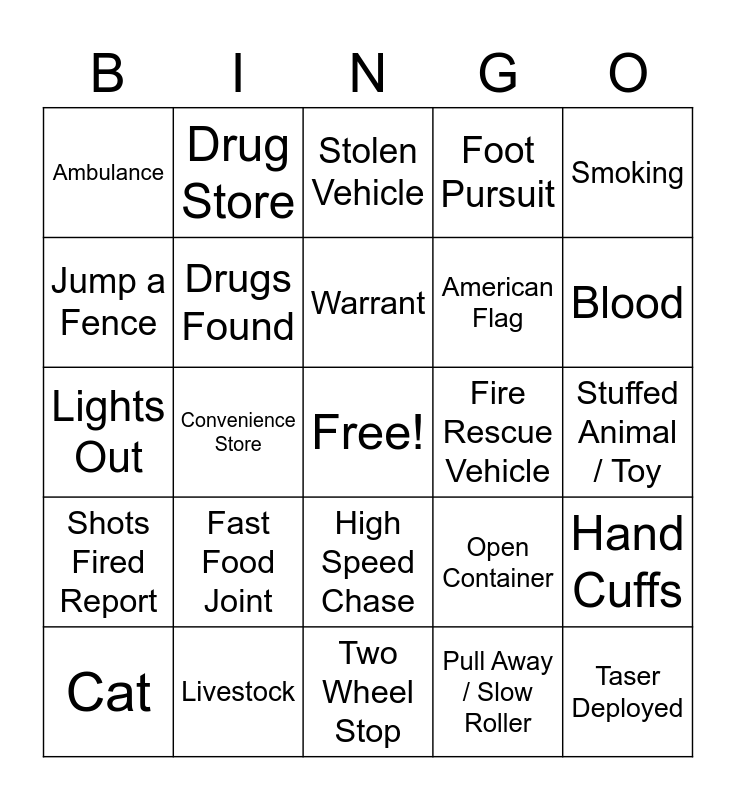This bingo card has a free space and 35 words: Gun Drawn, Gun Found, Weed Found, Drugs Found, High Speed Chase, Foot Pursuit, Jump a Fence, Tackle Take Down, Warrant, No ID / Expired Tags, Lights Out, Smoking, Face Tattoo, Bad Fitting Clothes, Ambulance, Fire Rescue Vehicle, Pull Away / Slow Roller, Convenience Store, Shots Fired Report, Taser Deployed, Open Container, Cat, Hand Cuffs, Livestock, Stolen Vehicle, Blood, Nike Shirt or Hat, Sports Shirt or Hat, American Flag, Stuffed Animal / Toy, Car Wreck, Two Wheel Stop, Fast Food Joint, Drug Store and K9 Deployed.