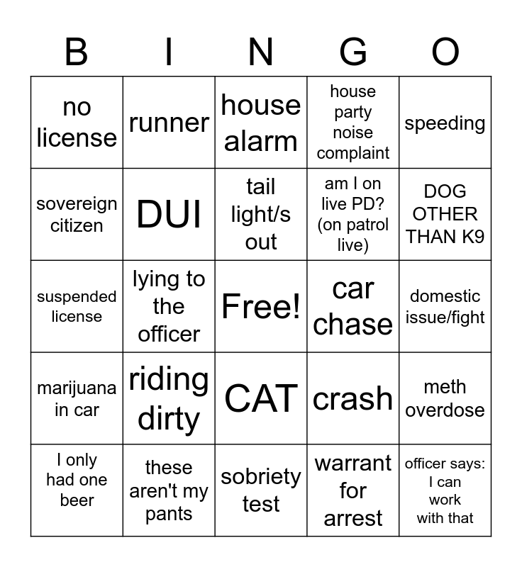 This bingo card has a free space and 24 words: riding dirty, these aren't my pants, tail light/s out, I only had one beer, speeding, no license, sovereign citizen, runner, car chase, CAT, am I on live PD? (on patrol live), suspended license, crash, meth overdose, DUI, warrant for arrest, domestic issue/fight, house alarm, DOG OTHER THAN K9, lying to the officer, officer says: I can work with that, marijuana in car, house party noise complaint and sobriety test.