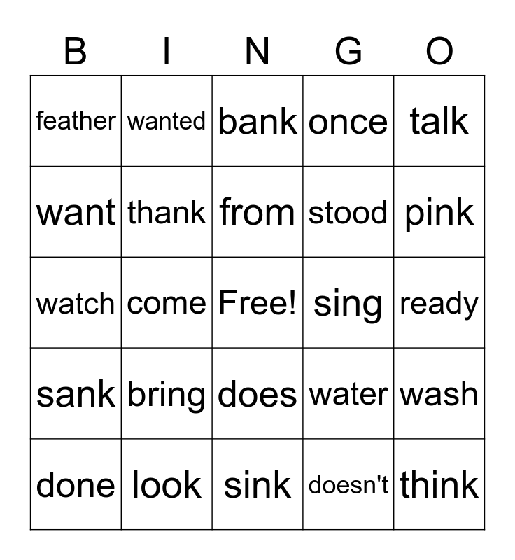 This bingo card has a free space and 26 words: does, doesn't, from, look, talk, feather, want, wanted, ready, water, stood, watch, wash, done, come, one, once, sank, bank, think, pink, sink, sing, bring, thank and drank.