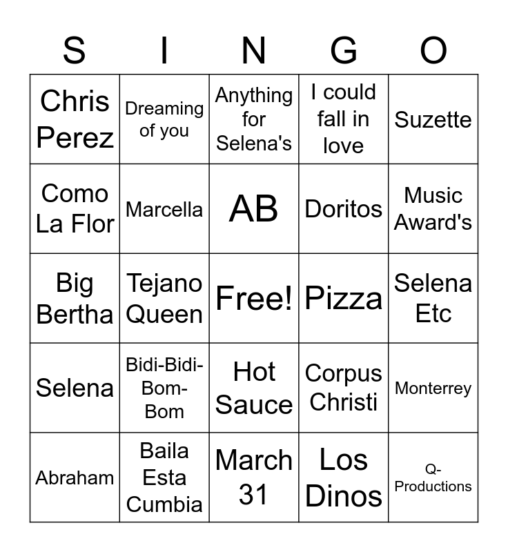 This bingo card has a free space and 25 words: Bidi-Bidi-Bom-Bom, March 31, AB, Abraham, Suzette, Chris Perez, Como La Flor, Dreaming of you, Pizza, Hot Sauce, Doritos, Big Bertha, Corpus Christi, Monterrey, Marcella, Amor Prohibido, Selena Etc, Anything for Selena's, Music Award's, Tejano Queen, Q-Productions, Baila Esta Cumbia, Selena, I could fall in love and Los Dinos.
