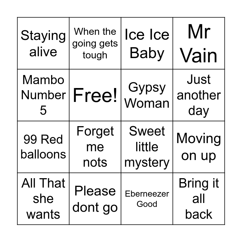 This bingo card has 48 words: What's Up, All That she wants, Walking on broken glass, Boom Shaka-Lak, Barby Girl, 9pm Till I Come, When the going gets tough, My heart will go on, Free!, Gangsta’s Paradise, Gypsy Woman, Mr Vain, Things can only get better, Sunchyme, Blue (Da Ba Deee), A little less conversation, Just another day, Please dont go, I’ve been thinking about you, Mambo Number 5, Moving on up, Return of the Mack, Staying alive, 99 Red balloons, How Bizarre, Forget me nots, Vibe, I’m too sexy, Children, Bring it all back, On a Ragga tip, Music sounds better with you, Tragedy, Cecilia, Relight my fire, Pump up the jam, Love shack, Eberneezer Good, Wannabe, Sexbomb, The Real Thing, Baker Street, Ice Ice Baby, What’s love got to do with it, Sweet little mystery, Saturday night, Greatest love of all and Men in black.