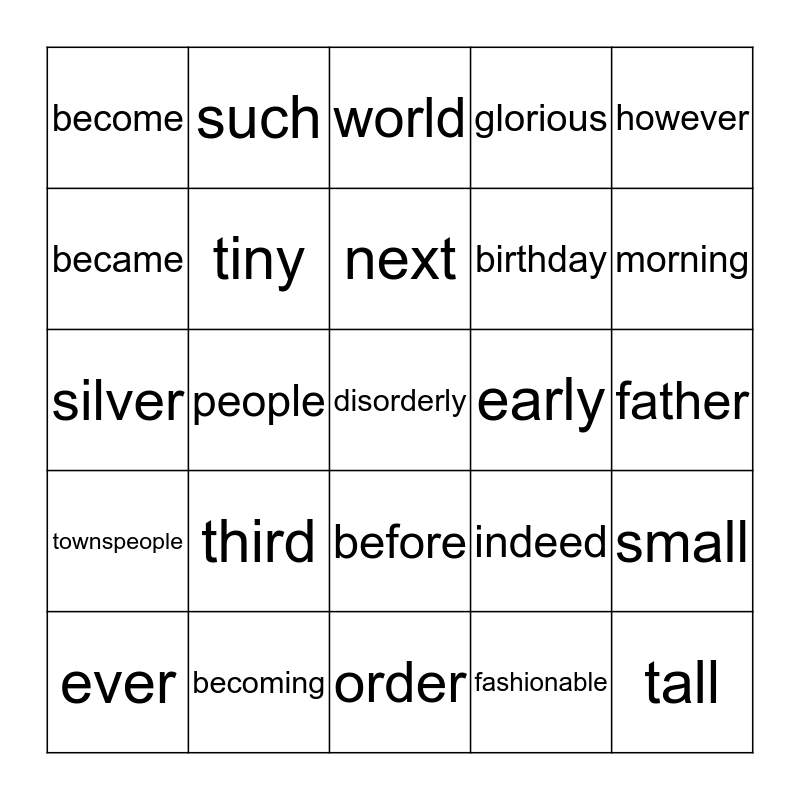 This bingo card has 25 words: third, order, next, ever, however, become, became, such, early, before, birthday, silver, indeed, small, tiny, tall, father, world, morning, people, disorderly, becoming, townspeople, glorious and fashionable.
