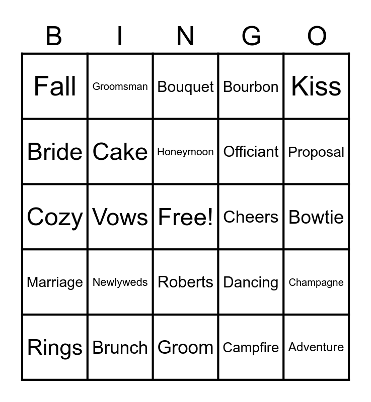 This bingo card has a free space and 39 words: Yogi, Jules, Wedding, Cake, Rings, Roberts, Honeymoon, Love, Kiss, Marriage, Vows, Bourbon, Adventure, Bowtie, Cheers, Newlyweds, Toast, Fall, Bridesmaid, Dancing, Bride, Groom, Officiant, Proposal, S'mores, Travel, FoodTruck, Friends, Family, Groomsman, Cigars, Cocktails, Bouquet, Brunch, Campfire, Centerpiece, Champagne, Cozy and Joy.