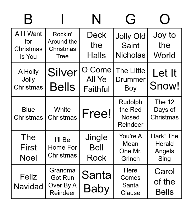 This bingo card has a free space and 38 words: O Little Town of Bethlehem, I Wish You A Merry Christmas, O Holy Night, Silver Bells, Hark! The Herald Angels Sing, I'll Be Home For Christmas, O Come All Ye Faithful, Silent Night, Joy to the World, The Little Drummer Boy, White Christmas, Jolly Old Saint Nicholas, Carol of the Bells, The 12 Days of Christmas, A Holly Jolly Christmas, The First Noel, Frosty the Snowman, Deck the Halls, Santa Clause is Coming to Town, Rudolph the Red Nosed Reindeer, All I Want for Christmas is You, Grandma Got Run Over By A Reindeer, Let It Snow!, Feliz Navidad, Last Christmas, Santa Baby, Winter Wonderland, Have Yourself a Merry Little Christmas, The Christmas Song, Run Rudolph Run, It's Beginning to Look a lot Like Christmas, Jingle Bell Rock, Here Comes Santa Clause, Rockin' Around the Christmas Tree, Sleigh Ride, You're A Mean One Mr. Grinch, Blue Christmas and Please Come Home for Christmas.