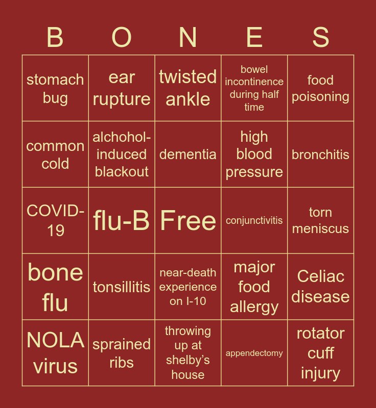 This bingo card has a free space and 24 words: NOLA virus, tonsillitis, dementia, appendectomy, food poisoning, stomach bug, ear rupture, twisted ankle, conjunctivitis, torn meniscus, COVID-19, alchohol-induced blackout, major food allergy, Celiac disease, common cold, sprained ribs, throwing up at shelby’s house, bowel incontinence during half time, bronchitis, bone flu, flu-B, near-death experience on I-10, high blood pressure and rotator cuff injury.
