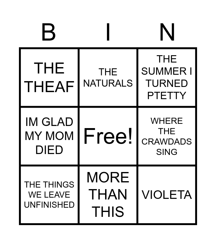 This bingo card has a free space and 8 words: WHERE THE CRAWDADS SING, THE SUMMER I TURNED PTETTY, THE NATURALS, THE THINGS WE LEAVE UNFINISHED, THE THEAF, VIOLETA, IM GLAD MY MOM DIED and MORE THAN THIS.