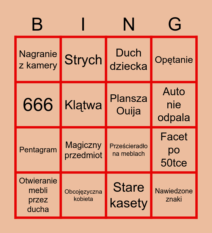 This bingo card has 16 words: Obcojęzyczna kobieta, Facet po 50tce, Duch dziecka, Nagranie z kamery, Pentagram, Strych, Prześcieradło na meblach, Stare kasety, 666, Klątwa, Otwieranie mebli przez ducha, Opętanie, Magiczny przedmiot, Auto nie odpala, Plansza Ouija and Nawiedzone znaki.