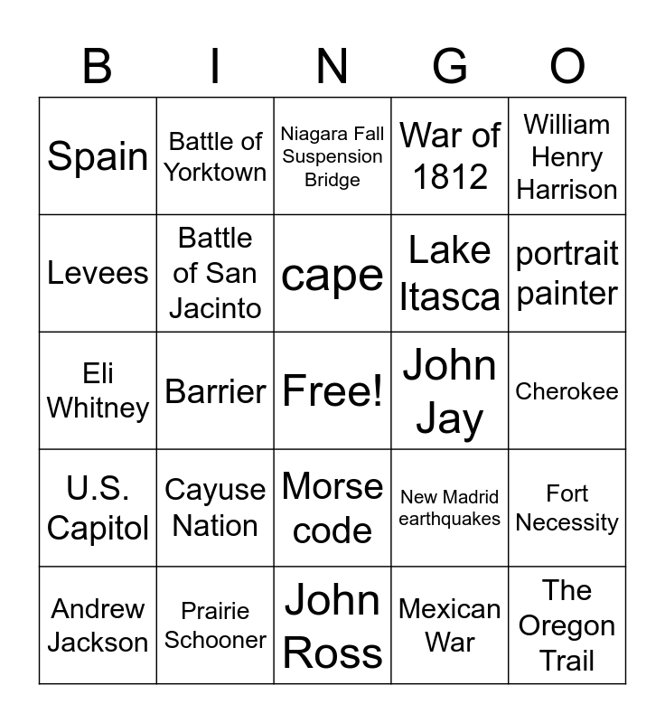 This bingo card has a free space and 29 words: Andrew Jackson, Birds of America, Barrier, Canada, Spain, Niagara Fall Suspension Bridge, Battle of San Jacinto, Cayuse Nation, John Jay, Prairie Schooner, Cherokee, The Oregon Trail, John Ross, Mexican War, portrait painter, Manifest Destiny, Morse code, U.S. Capitol, William Henry Harrison, Eli Whitney, New Madrid earthquakes, Fort Rosalie, Lake Itasca, Levees, War of 1812, Battle of Yorktown, Fort Necessity, cape and England.