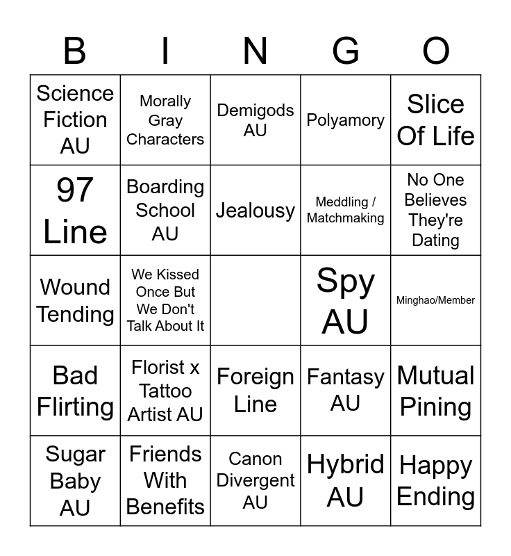 This bingo card has a free space and 132 words: 3+1 / 5+1 Things, Accidental Relationship, Acts Of Service, Actually Fake Dating, Angst With A Happy Ending, Arranged Marriage, Bad Flirting, Banter / Bickering, Based On Other Media, Character Study, Childhood Friends, Childhood Friends To Lovers, Confessions, Didn't Know They Were Dating, Domesticity, Enemies / Rivals To Lovers, Established Relationship, Exes To Lovers, Fake Relationship, Found Family, Friends To Lovers, Friends With Benefits, Happy Ending, Humor, Hurt/Comfort, Idiots To Lovers, Jealousy, Late-Night Conversations, Love Languages, Marriage Of Convenience, Meddling / Matchmaking, Morally Gray Characters, Mutual Pining, No One Believes They're Dating, Non-Linear Narrative, Not Actually Unrequited Love, Only One Bed, Opposites Attract, Partners In Crime, Pining, Polyamory, Practice Kissing, Professional Partners To Lovers, Right Person Wrong Time, Romcom, Roommates, Secret Relationship, Sharing Dreams, Single Parent, Slice Of Life, Slow Burn, Soulmates, Strangers To Lovers, Stuck Together / Forced Proximity, Time Loop, Trope Subversion, Unrequited Love, Unrequited Rivalry, Very Obvious A Very Oblivious B, We Kissed Once But We Don't Talk About It, Wound Tending, Monogamous Relationship, Poly Relationship, OT13, Vocal Line, Hip Hop Line, Performance Line, 95 Line, 96 Line, 97 Line, Maknae Line, Foreign Line, Booseoksoon, Leaders, Seungcheol/Member, Jeonghan/Member, Joshua/Member, Jun/Member, Hoshi/Member, Wonwoo/Member, Woozi/Member, Dokyeom/Member, Mingyu/Member, Minghao/Member, Seungkwan/Member, Vernon/Member, Dino/Member, Angels and Demons AU, Apocalypse / Dystopian AU, Bakery AU, Boarding School AU, Bodyguard AU, Buzzfeed Unsolved AU, Canon Divergent AU, Canon-Compliant AU, Coffee Shop AU, College / University AU, Crime / Criminals AU, Cyberpunk AU, Dark Academia AU, Demigods AU, Fantasy AU, Florist x Tattoo Artist AU, Folklore / Mythology AU, Fraternity AU, GOSE - Bad Clue AU, GOSE - Ego AU, GOSE - Wonwoo's Diary AU, Heist AU, Historical AU, Hospital AU, Hybrid AU, Lawyers AU, Magical AU, Modern With Magic AU, Non-Idol Celebrity AU, Non-Traditional A/B/O AU, Office AU, Omegaverse AU, Pacific Rim AU, Road Trip AU, Rockstar / Band AU, Royalty AU, Science Fiction AU, Sports AU, Spy AU, Sugar Baby AU, Superpowers / Superhero AU, Urban Fantasy AU, Vampire AU, Wedding Planner AU and Werewolf / Shapeshifter AU.