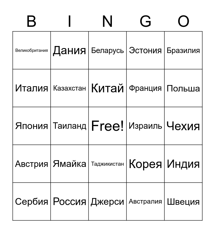 This bingo card has 25 words: Австрия, Россия, Free!, Австралия, Бразилия, Великобритания, Дания, Беларусь, Израиль, Индия, Италия, Казахстан, Джерси, Корея, Польша, Сербия, Таиланд, Китай, Франция, Чехия, Япония, Ямайка, Таджикистан, Эстония and Швеция.