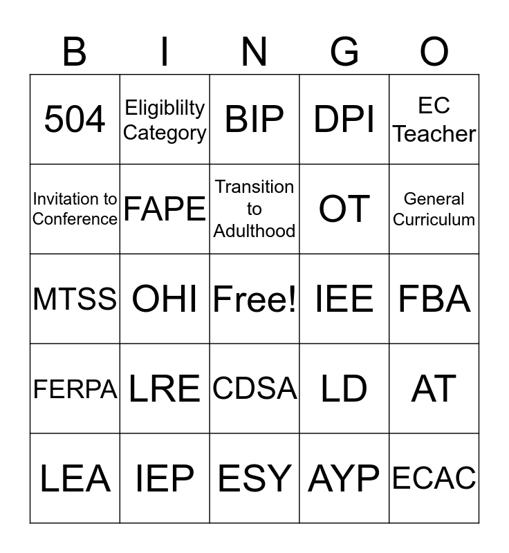 This bingo card has a free space and 24 words: LRE, IEP, Transition to Adulthood, LEA, EC Teacher, 504, Invitation to Conference, Eligiblilty Category, IEE, CDSA, OT, MTSS, LD, AT, FAPE, AYP, FBA, BIP, General Curriculum, OHI, ECAC, FERPA, DPI and ESY.