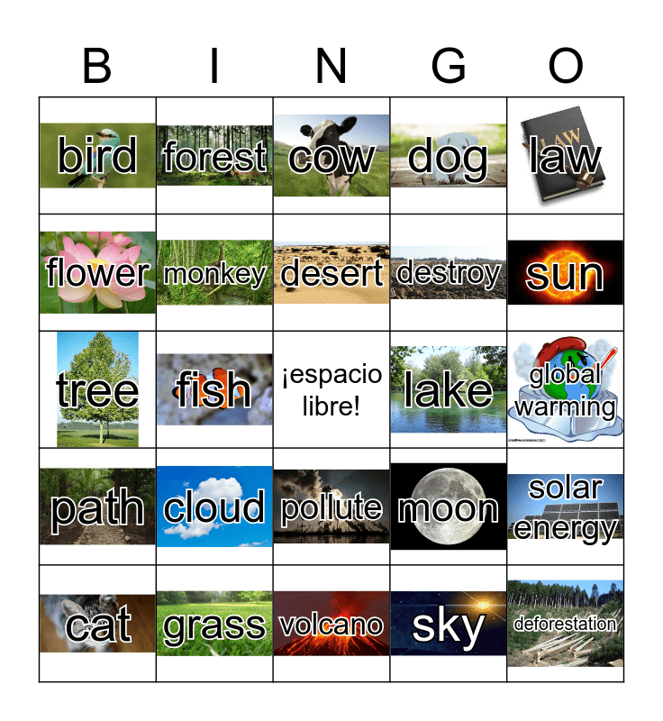 This bingo card has 24 images, a free space and 24 words: cloud, grass, desert, cat, law, bird, flower, forest, lake, pollute, destroy, tree, moon, solar energy, monkey, sky, global warming, cow, sun, fish, deforestation, path, dog and volcano.