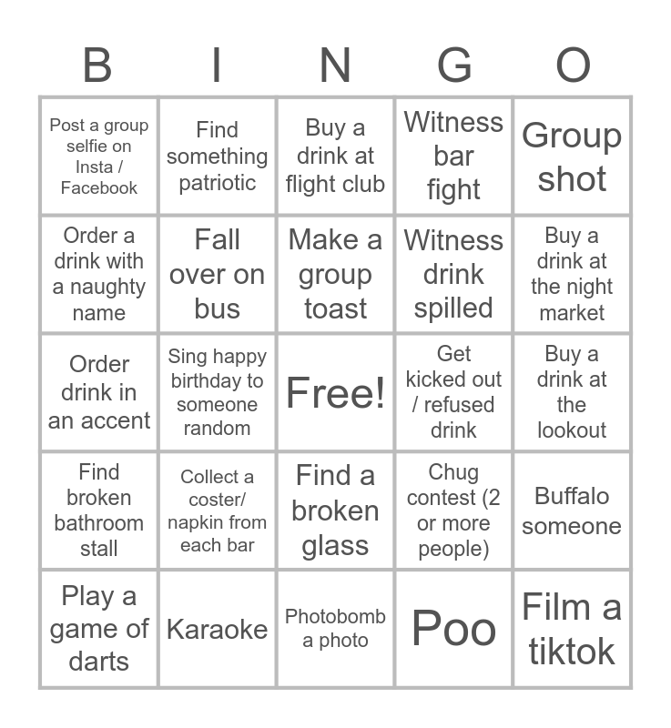 This bingo card has a free space and 25 words: Collect a coster/ napkin from each bar, Photobomb a photo, Make a group toast, Play a game of darts, Group shot, Post a group selfie on Insta / Facebook, Order a drink with a naughty name, Find something patriotic, Get kicked out / refused drink, Find a broken glass, Witness drink spilled, Order drink in an accent, Chug contest (2 or more people), Buffalo someone, Fall over on bus, Switch item of clothing with someone (must keep on for majority of one bar stop), Buy a drink at the lookout, Buy a drink at flight club, Buy a drink at the night market, Sing happy birthday to someone random, Film a tiktok, Karaoke, Find broken bathroom stall, Witness bar fight and Poo.