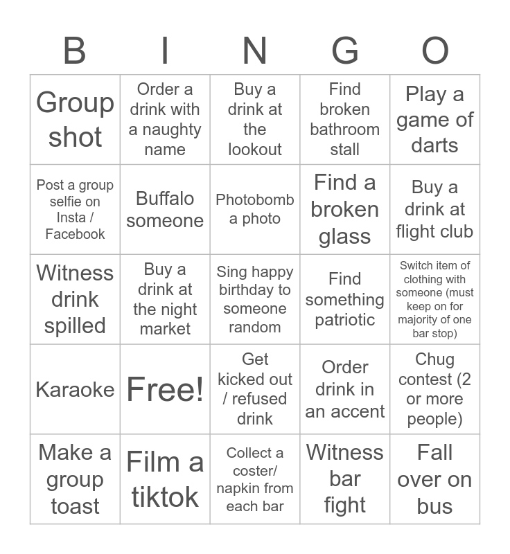 This bingo card has 25 words: Free!, Collect a coster/ napkin from each bar, Photobomb a photo, Make a group toast, Play a game of darts, Group shot, Post a group selfie on Insta / Facebook, Order a drink with a naughty name, Find something patriotic, Get kicked out / refused drink, Find a broken glass, Witness drink spilled, Order drink in an accent, Chug contest (2 or more people), Buffalo someone, Fall over on bus, Switch item of clothing with someone (must keep on for majority of one bar stop), Buy a drink at the lookout, Buy a drink at flight club, Buy a drink at the night market, Sing happy birthday to someone random, Film a tiktok, Karaoke, Find broken bathroom stall and Witness bar fight.