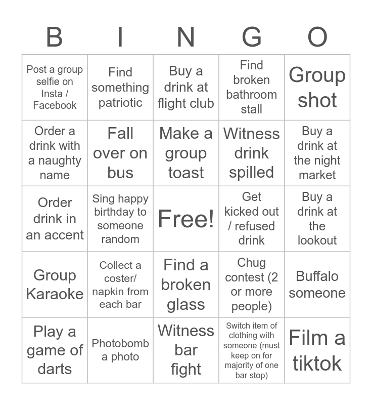 This bingo card has a free space and 24 words: Collect a coster/ napkin from each bar, Photobomb a photo, Make a group toast, Play a game of darts, Group shot, Post a group selfie on Insta / Facebook, Order a drink with a naughty name, Find something patriotic, Get kicked out / refused drink, Find a broken glass, Witness drink spilled, Order drink in an accent, Chug contest (2 or more people), Buffalo someone, Fall over on bus, Switch item of clothing with someone (must keep on for majority of one bar stop), Buy a drink at the lookout, Buy a drink at flight club, Buy a drink at the night market, Sing happy birthday to someone random, Film a tiktok, Group Karaoke, Find broken bathroom stall and Witness bar fight.