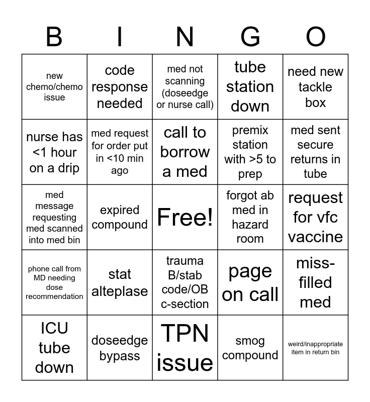 This bingo card has a free space and 50 words: missing lipid/adjust lipid time, weird/inappropriate item in return bin, compatibility question, TPN issue, stat alteplase, temperature/pressure alarm, code response needed, picu missing med, nurse has <1 hour on a drip, move meds between omnicell, med request for order put in <10 min ago, tube station down, miss-filled med, page on call, request for med to be tubed on do not tube list, retail (break-in, counseling, nurse calling wrong #), call to borrow a med, forgot ab med in hazard room, med message requesting drug in omnicell, need new tackle box, expired compound, smog compound, new chemo/chemo issue, premix station with >5 to prep, page or call NNP, rec from a consult service, med sent secure returns in tube, omnicell discrepancy, med not scanning (doseedge or nurse call), trauma B/stab code/OB c-section, expired med (not compound), new DKA needs bags STAT, calling maintenance or environmental services, pharm-is ticket, doseedge bypass, brand new TPN, new LOS/EOS orders, call from outside pharm to borrow med, tube shut down for full tube, request for vfc vaccine, recon antibiotic, ID home med, status board clear, request for on call electrolytes, ICU tube down, med message requesting med scanned into med bin, albuterol syringe, rabies vaccine, phone call from MD needing dose recommendation and critical dose warning override.
