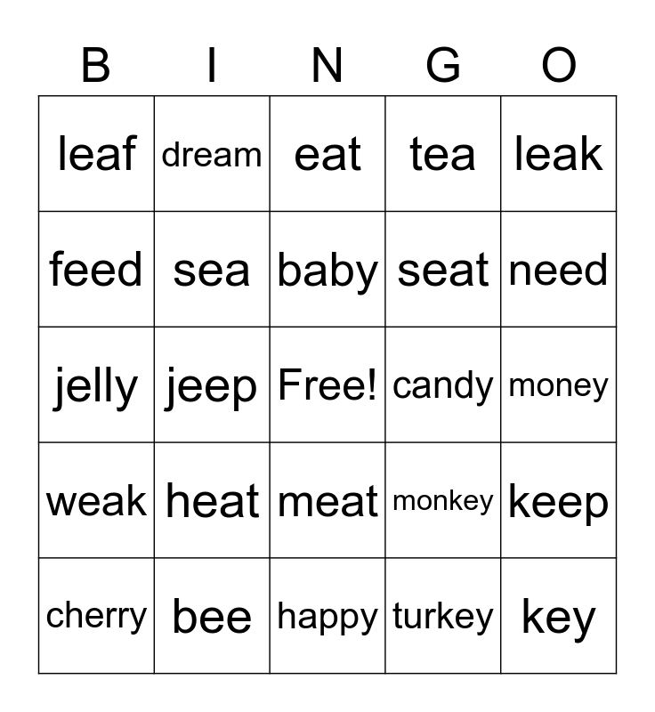 This bingo card has a free space and 30 words: bee, feet, jeep, seed, leaf, eat, sea, meat, candy, happy, money, key, turkey, jeans, need, bunny, monkey, weak, heat, leak, jelly, clean, dream, seat, feed, tea, keep, cherry, baby and bead.
