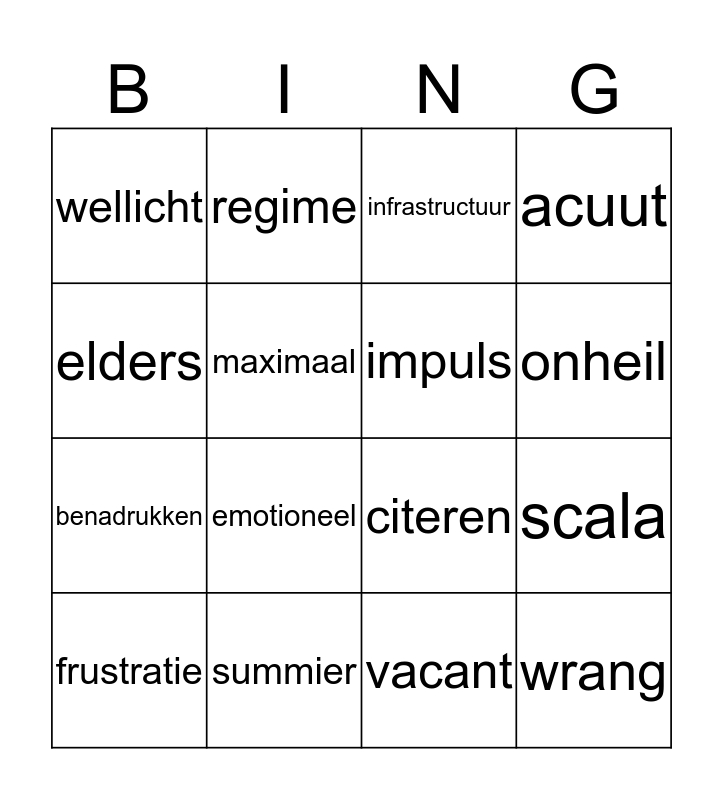 This bingo card has a free space and 15 words: frustratie, wrang, infrastructuur, wellicht, onheil, elders, emotioneel, vacant, maximaal, benadrukken, scala, acuut, impuls, regime and summier.