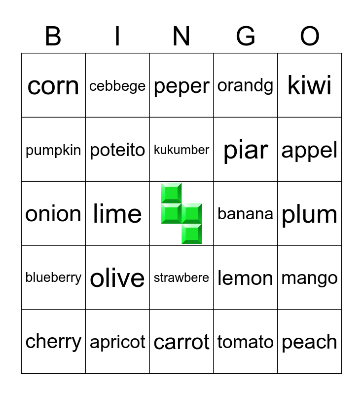 This bingo card has a free space and 24 words: cherry, olive, kukumber, tomato, kiwi, corn, cebbege, peper, banana, plum, onion, poteito, lemon, mango, pumpkin, apricot, carrot, orandg, appel, blueberry, lime, strawbere, piar and peach.