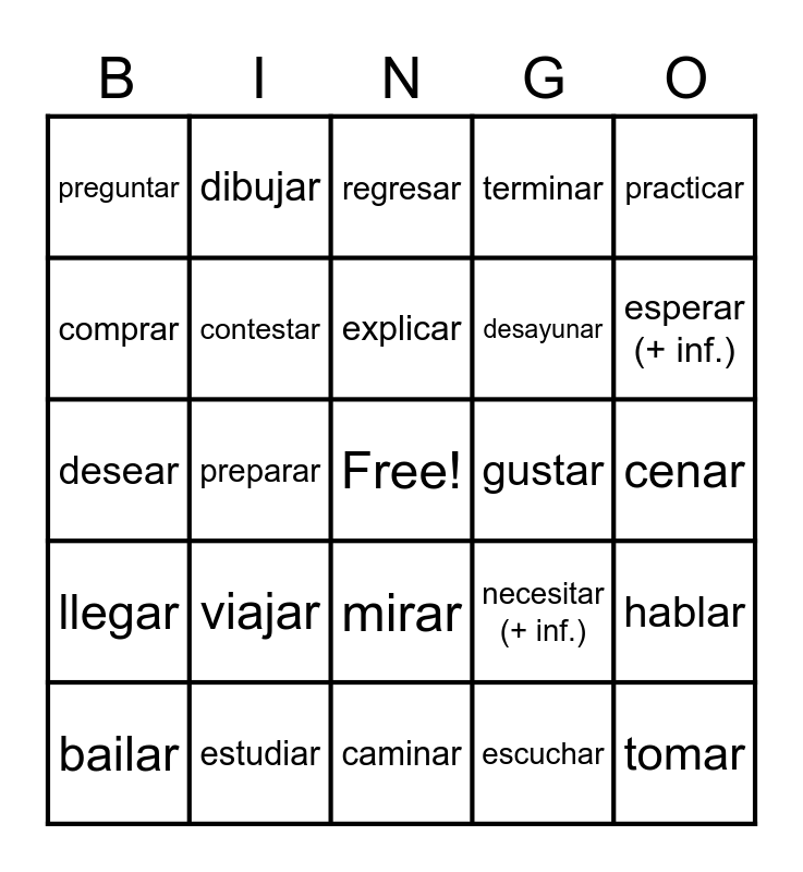 This bingo card has a free space and 32 words: bailar, buscar, caminar, cantar, cenar, comprar, contestar, conversar, desayunar, descansar, desear, dibujar, enseñar, escuchar, esperar (+ inf.), estar, estudiar, explicar, gustar, hablar, llegar, llevar, mirar, necesitar (+ inf.), practicar, preguntar, preparar, regresar, terminar, tomar, trabajar and viajar.