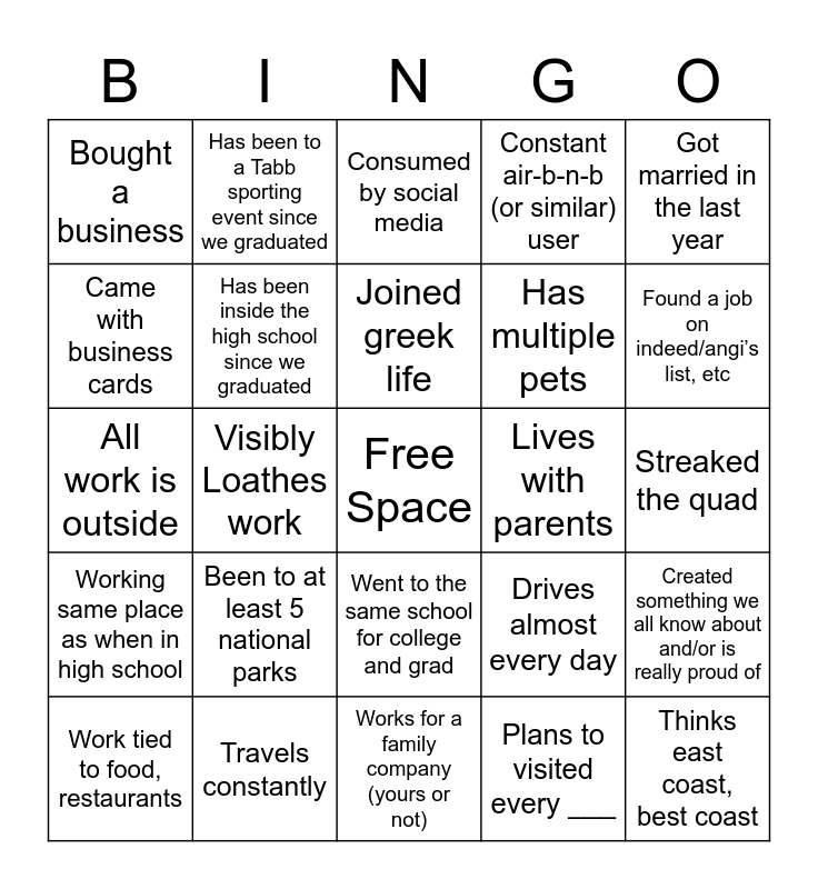 This bingo card has a free space and 90 words: Went to an in-state school for college, Went to an out-of-state school for college, Went to the same school for college and grad, Switched majors more than once, Went to more than one undergrad, Went to rival schools, Roomed with high school friend, Found spouse at school, Dropped out of school, International school/Trade school, Played a sport competitively (intramurals count) in school(s), Played a sport(s) competitively (intramurals count) that you had never played before, Slack-lined, Streaked the quad, Became a Teacher's assistant (TA), Joined greek life, Led a greek life org, Joined a club that did more for career growth/choice than a class did, Went to church on campus/near campus, Wore something today showing off the school they went to, Planning to go back to school, Realtor or has a realtor, Works for a family company (yours or not), Does remote work, All work is outside, Travels constantly, Works with celebrities or well-known (relatively) people, Social media influencer (or at least tries to be), Teacher, Medical doctor, Builder of cars or buildings or something, Created something we all know about and/or is really proud of, Put something in print, Working same place as when in high school, Bought a business, Constant air-b-n-b (or similar) user, Consumed by social media, Visibly Enjoys work, Visibly Loathes work, Found a job on indeed/angi’s list, etc, Work tied to food, restaurants, Came with business cards, Always ready to make a deal, Military, Owns a home, Drives almost every day, Still wears something from your high school wardrobe, No social media, Takes public transport/ride shares almost everywhere, Owns multiple cars, Got a pet during the pandemic, Has multiple pets, Has a child, Has multiple children, Lives in a tiny home or apartment, Renovating/renovated your current house, Lives with parents, Lives in VA, Kids go to Tabb or at least schools in the same district, Wants current or future kids to go to Tabb, Had a long distance relationship, Married your high school sweetheart, Complains about kids being on screens, Makes reference to 2012 and surviving the apocalypse, Mentions dislike of politicians whenever possible, Mentions COVID like it was an era, Visited every state, Plans to visited every ___, Follows a ___ around / visits a ___ whenever found (band, amusement park, restaurant) or whenever possible, Does a/did a __ (yearly event, marathon, conference), Been to at least 5 national parks, Thinks east coast, best coast, Remembers our prom song, In touch with a former THS teacher, Has been to a Tabb sporting event since we graduated, Has been inside the high school since we graduated, Bilingual (does not have to be perfect), Trilingual (does not have to be perfect), Fluent in the language you took in high school/middle school, Family still lives in York County, Currently engaged, Got married in the last year, Been married for over 5 years, Could run a faster mile time now than you could in high school, Visited a foreign country in the last 12 months, Went to a concert in the last 12 months, Recently got rid of all your low-rise, skinny jeans, Vegetarian or vegan, Does CrossFit / gym rat and Knows where your high school yearbooks are.