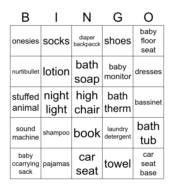 This bingo card has 38 words: Pack n play, bottle sterilizer, bath mitt, lotion, bath tub, shampoo, bath soap, wash cloth, baby floor seat, baby monitor, night light, shoes, high chair, bassinet, nurtibullet, sound machine, brush or comb, diaper backpacck, bath toys, bath therm, onesies, pajamas, dresses, baby ccarrying sack, stroller fan, car seat, car seat base, blanket, bottles, gift card, bib, book, towel, socks, pacifier, laundry detergent, stuffed animal and something personalized.