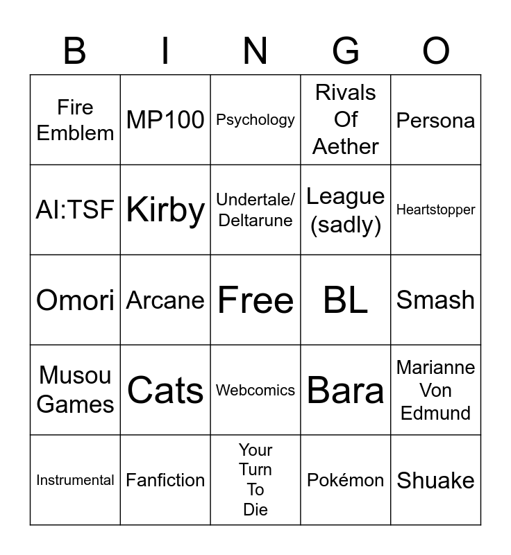 This bingo card has a free space and 24 words: Cats, Fanfiction, Undertale/ Deltarune, Instrumental, Persona, Fire Emblem, AI:TSF, MP100, BL, Webcomics, League (sadly), Omori, Bara, Marianne Von Edmund, Kirby, Pokémon, Smash, Psychology, Heartstopper, Arcane, Shuake, Musou Games, Rivals Of Aether and Your Turn To Die.