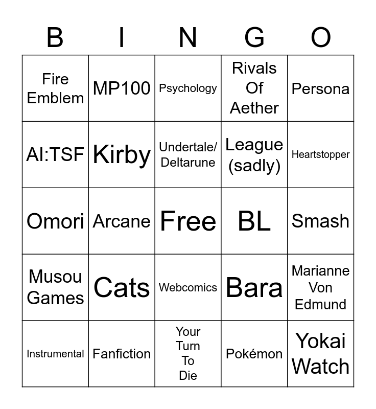 This bingo card has a free space and 24 words: Cats, Fanfiction, Undertale/ Deltarune, Instrumental, Persona, Fire Emblem, AI:TSF, MP100, BL, Webcomics, League (sadly), Omori, Bara, Marianne Von Edmund, Kirby, Pokémon, Smash, Psychology, Heartstopper, Arcane, Yokai Watch, Musou Games, Rivals Of Aether and Your Turn To Die.