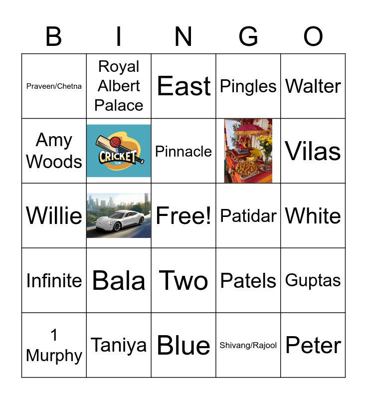 This bingo card has 8 images, a free space and 41 words: Three, Peter, Patels, Blue, Bala, Nine, Royal Albert Palace, Four, Amy Woods, My Wife, Pingles, Guptas, Patels, Lutes, Pinnacle, Patidar, Dina, Walter, Shivang/Rajool, Praveen/Chetna, Vilas, 1 Murphy, Van Cleef, Two, Infinite, LaTourelle, Murphy, Binaben, Taniya, Kris, Black, White, Tuesday, Classic Carney VII, Gorman, Mcbride, Willie, East, Solar, Amsterdam and Fruity Yogurt.