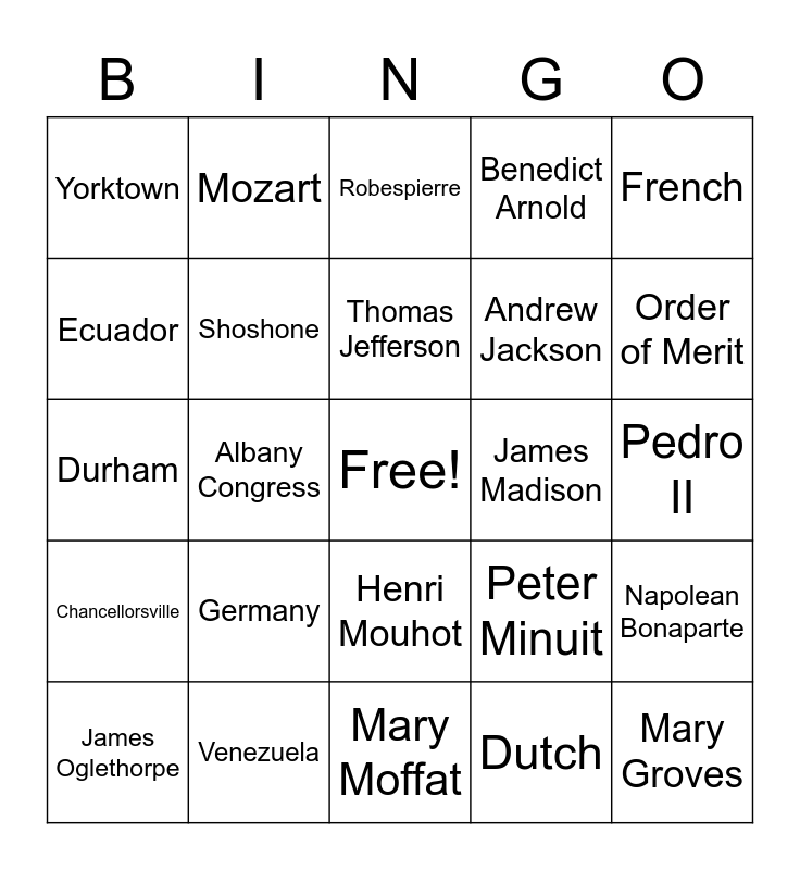 This bingo card has a free space and 29 words: James Oglethorpe, Silesia, Albany Congress, Catherine the Great, Yorktown, Robespierre, Shoshone, Germany, James Madison, Venezuela, Pedro II, Mary Groves, Mary Moffat, Dutch, Order of Merit, HMS Beagle, Henri Mouhot, Chancellorsville, French, Durham, Peter Minuit, Austria, Andrew Jackson, Ecuador, Benedict Arnold, Mozart, Napolean Bonaparte, Thomas Jefferson and William Wilberforce.