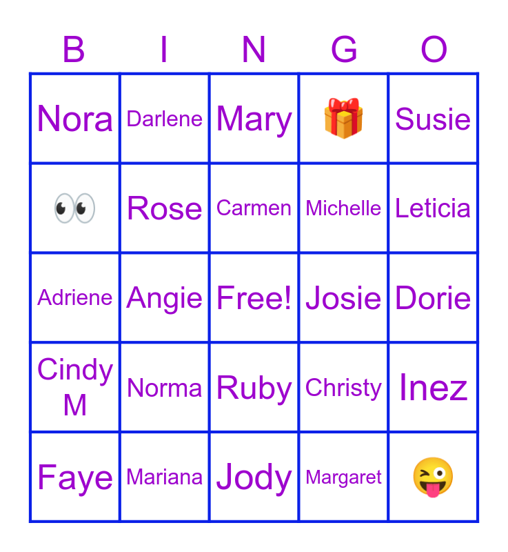 This bingo card has a free space and 24 words: Faye, Norma, Carmen, Margaret, Susie, Nora, Darlene, Mary, Josie, Dorie, Adriene, Rose, Christy, Inez, 👀, Mariana, Jody, 🎁, Leticia, Cindy M, Angie, Ruby, Michelle and 😜.