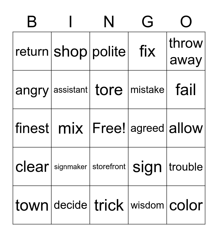 This bingo card has a free space and 24 words: signmaker, decide, tore, town, throw away, return, angry, shop, agreed, storefront, mistake, finest, sign, trouble, assistant, wisdom, allow, polite, fail, mix, color, clear, fix and trick.